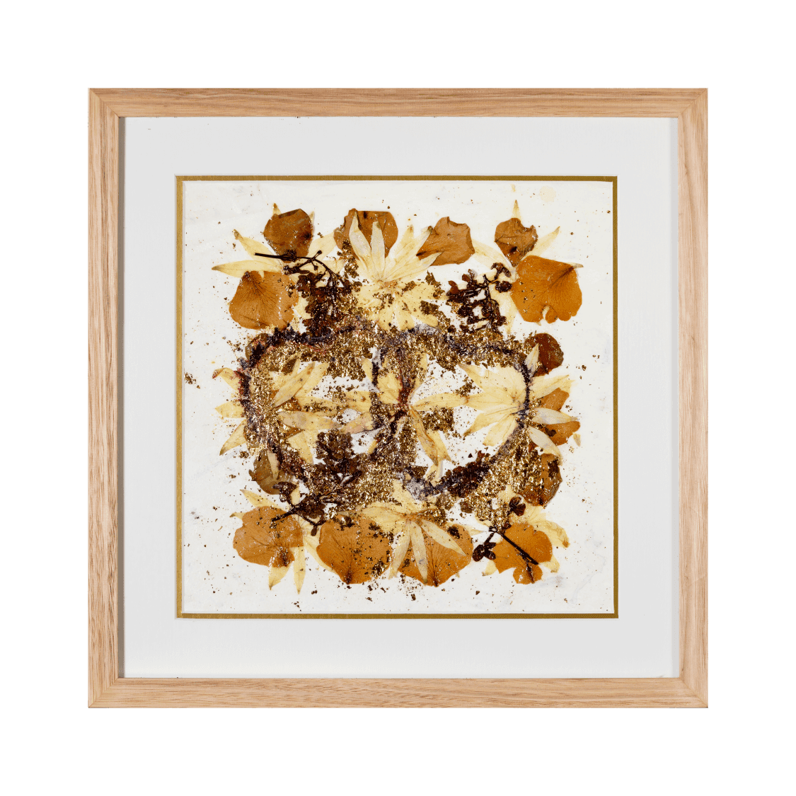 Jayne’s pressed flower artwork with two interlocking hearts to represent eternity. For this piece, Jayne used real bridal flowers and non-toxic Windsor and Newton watercolours with 24kt gold leaf around the hearts.